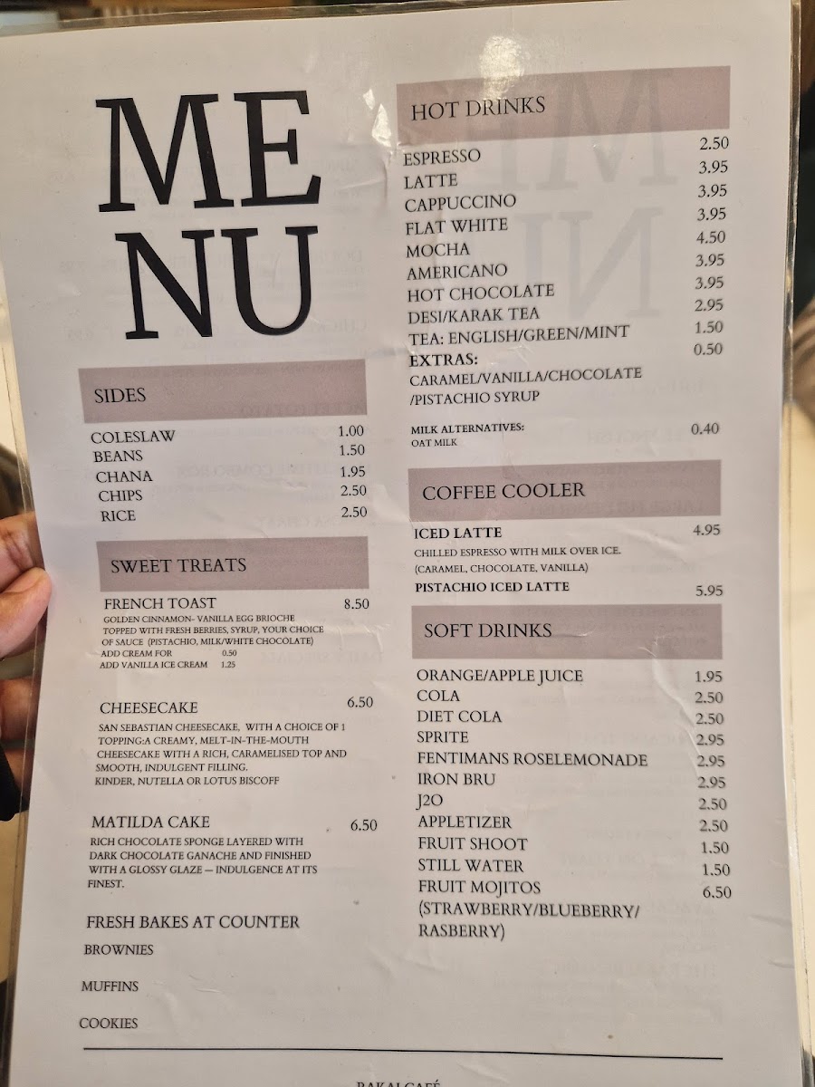 Hot Drinks include classic coffee options such as Espresso (£2.50), Latte (£3.95), Cappuccino (£3.95), Flat White (£3.95), Mocha (£4.50), Americano (£3.95), and Hot Chocolate (£3.95). Traditional tea is also available with Desi/Karak Tea priced at £2.95.